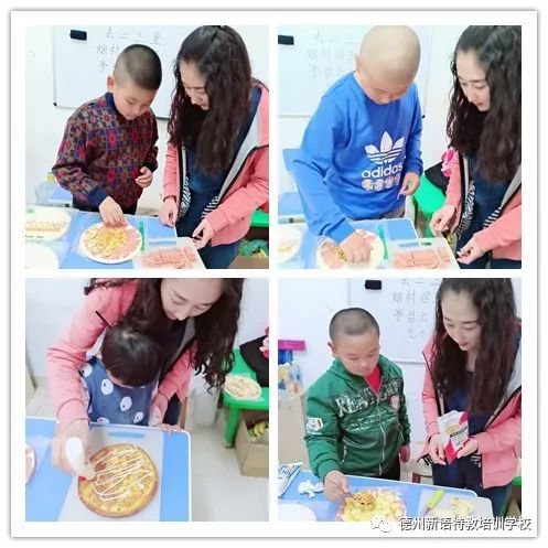在王老師的指導(dǎo)下,“小烘焙師”們自己動手,在披薩餅胚上添加足足的餡料。隔著屏幕都想流口水呢~