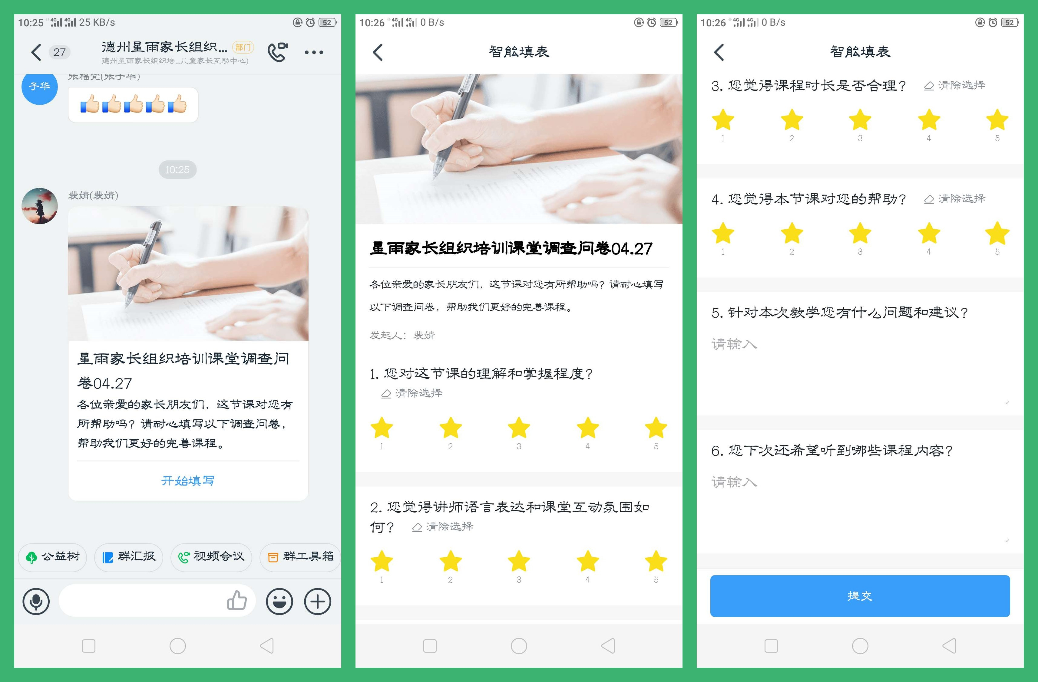 了解家長們的需求是我們進步必不可少的步驟,裴婧老師按照慣例將課堂調(diào)查問卷發(fā)至組織群,請家長們填寫。