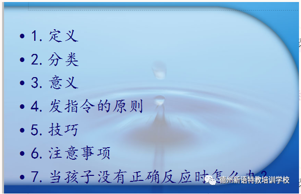 王老師首先從什么是“指令”出發(fā)進行講述,何為“指令”,簡單說就是想讓孩子做什么事時說的話,要想與孩子溝通好、交流好,就要掌握發(fā)指令的原則和技巧!進而進行具體闡述,并說明注意事項,以及孩子沒有正確反映時的處理方式。