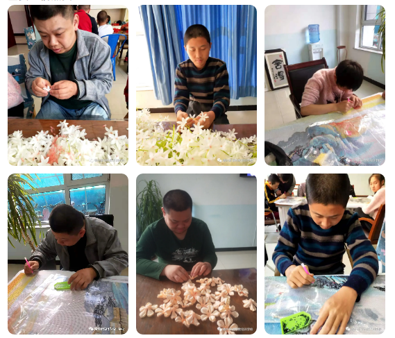 根據(jù)孩子們的能力和程度不同,我們聯(lián)系了手工瓶蓋、插花、鉆石繡等工作。每天在輔助性就業(yè)老師的耐心指導(dǎo)下,孩子們的生活充實(shí)了很多,也更加有意義。