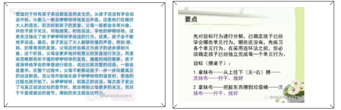 通過此次培訓(xùn),家長們明確了塑造法與連環(huán)法的概念,了解了運用塑造法和連環(huán)法進(jìn)行教學(xué)的意義,知道了在什么情況下可以使用塑造法與連環(huán)法,這些對孩子們以后的訓(xùn)練都會起到積極作用。