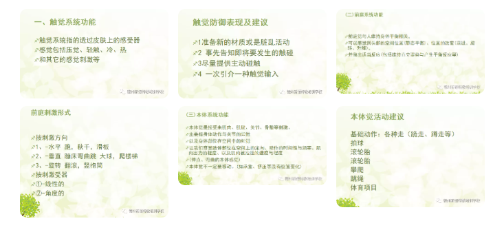 重點(diǎn)講述了觸覺、前庭、和本體三大感覺系統(tǒng),分別闡述了三種感覺系統(tǒng)未發(fā)育好的表現(xiàn),并給出活動(dòng)建議。