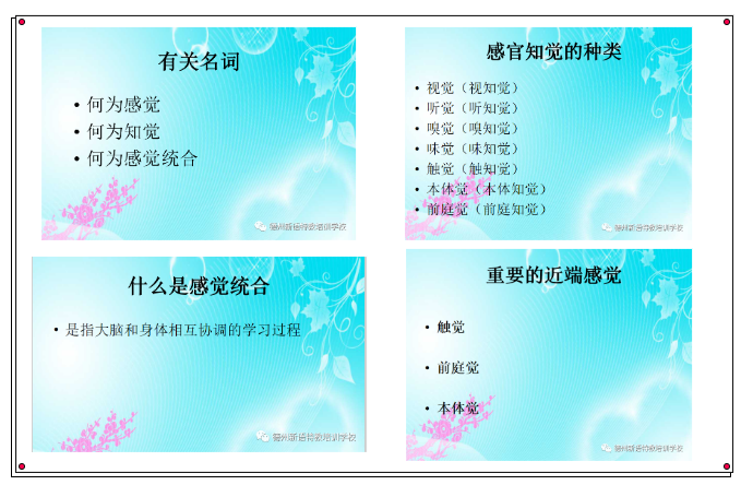 盧老師由身邊的例子開始講述,什么是“感覺”,什么是“知覺”,列舉感官知覺的種類,進而闡述了什么是感覺統(tǒng)合,應(yīng)該如何給孩子進行感覺統(tǒng)合訓(xùn)練。
