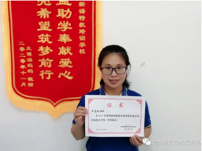 盧老師自大學(xué)畢業(yè)后一直從事教育行業(yè),2013年入職德州新語從事特教教學(xué),一直未脫離一線教學(xué),專業(yè)理論扎實,并積累了大量的實踐經(jīng)驗,曾獲得“全國孤獨癥特殊教育教師激勵計劃優(yōu)秀教師獎”,還被評為“經(jīng)濟技術(shù)開發(fā)區(qū)優(yōu)秀教師”。