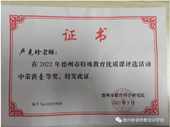 賀德州新語特教學(xué)校盧克珍老師參加2022年德州市特殊教育優(yōu)質(zhì)課評選活動榮獲一等獎。