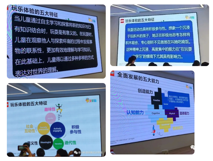 兩位老師首先系統(tǒng)介紹了什么是樂(lè)高,玩樂(lè)體驗(yàn)的五大特征,如何發(fā)展兒童的五大能力,以及樂(lè)高基本的拼搭方法、樂(lè)高在不同場(chǎng)景下的各種活動(dòng),最終達(dá)到啟智、融合的目的。