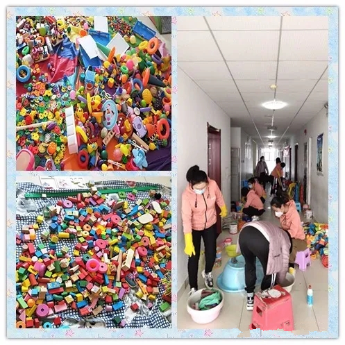 討論結(jié)束后,老師們將個訓(xùn)室教具進行分類清洗、消毒和晾曬。