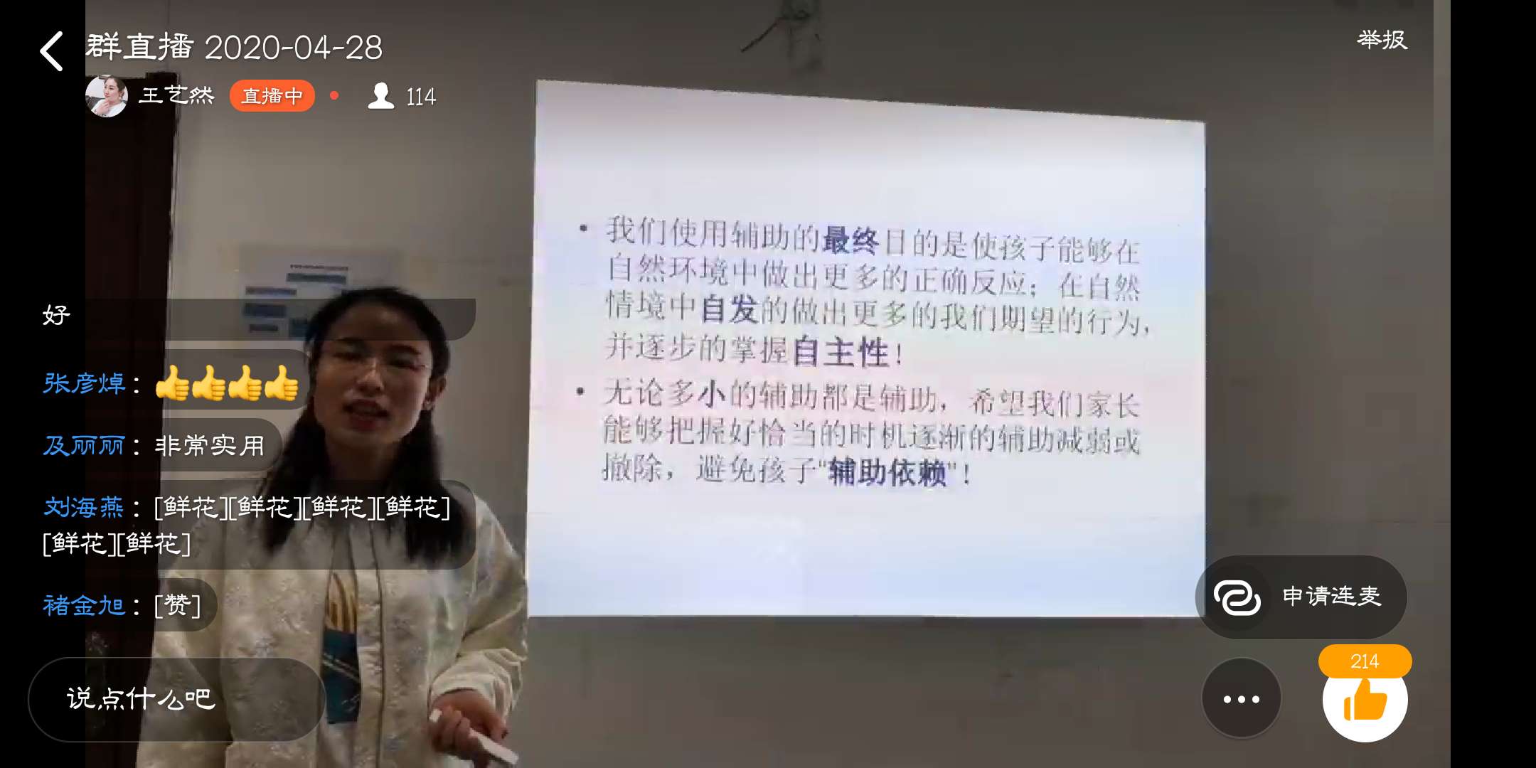 李老師自2008年踏入特教領(lǐng)域,從業(yè)十二年積累了大量的教學(xué)經(jīng)驗,她不僅理論基礎(chǔ)扎實,而且思路靈活,教學(xué)新穎,深受家長們喜歡!本次直播課分享課程《怎樣更好的使用輔助》,聽課人次114人,截止目前觀看回放人次54人,聽課受眾共計168人次。