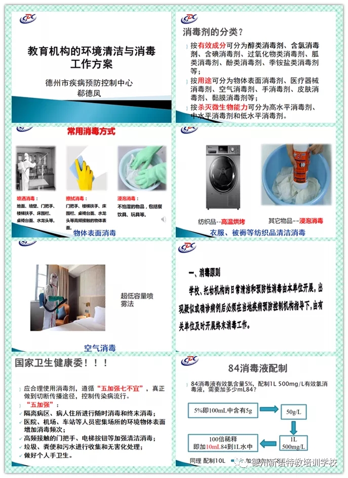 郗老師則講解了環(huán)境清潔與消毒的具體操作方法,從消毒劑的種類開始,進而講述了常用的消毒方式,以及不同情況下消毒液的配比,內(nèi)容詳細實用,強調(diào)應(yīng)合理使用消毒劑,遵循“五加強七不宜”,真正做到切斷傳播途徑,控制傳染病流行。