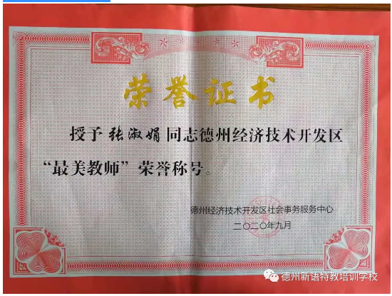 賀德州新語(yǔ)特教培訓(xùn)學(xué)校張淑娟老師榮獲德州經(jīng)濟(jì)技術(shù)開(kāi)發(fā)區(qū)“最美教師”榮譽(yù)稱(chēng)號(hào)。
