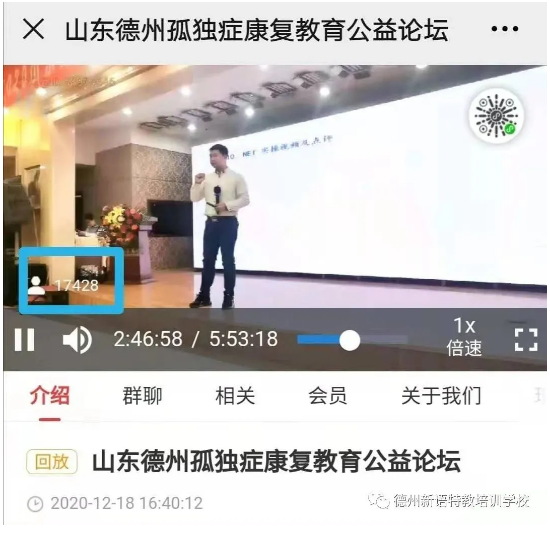 為加強(qiáng)社會(huì)對(duì)孤獨(dú)癥兒童的關(guān)注度,讓每一名孤獨(dú)癥兒童都能享受正常的生活,2020年12月18日,由山東德州新語(yǔ)特教培訓(xùn)學(xué)校主辦,山東德州星雨特殊兒童家長(zhǎng)互助中心協(xié)辦的,為期兩天的第五屆山東德州孤獨(dú)癥康復(fù)教育公益論壇,在德州凱元溫泉度假村酒店三樓會(huì)議中心正式開(kāi)課。因疫情原因,會(huì)場(chǎng)內(nèi)學(xué)員控制在300人以內(nèi),論壇全程直播,截止目前,直播觀看累計(jì)17428人次。