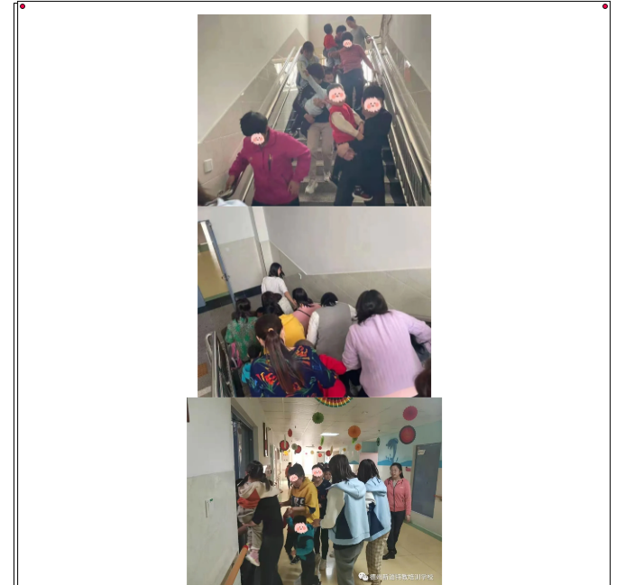 爸爸媽媽在老師們的引領下有序下樓,確保無踩踏,不擁擠。
