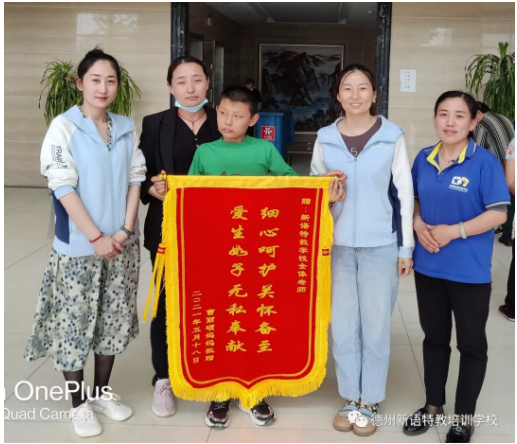 2021年5月19日,德州新語(yǔ)特教培訓(xùn)學(xué)校三年級(jí)二班曹麗碩媽媽為學(xué)校送來(lái)錦旗“細(xì)心呵護(hù)關(guān)懷備至,愛(ài)生如子無(wú)私奉獻(xiàn)”。