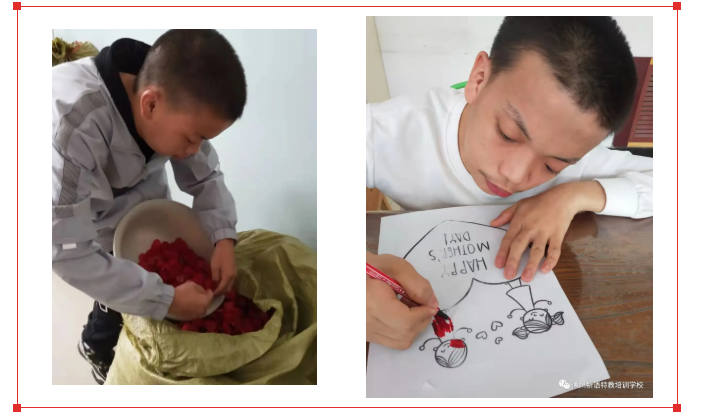 班主任陳煥香老師和助教老師通過一段時(shí)間的接觸,為孩子制定了合適的訓(xùn)練方案:建立關(guān)系,同伴支持,提高動(dòng)手能力。如今的小強(qiáng),愛笑了,也愿意和老師同學(xué)們交流了。