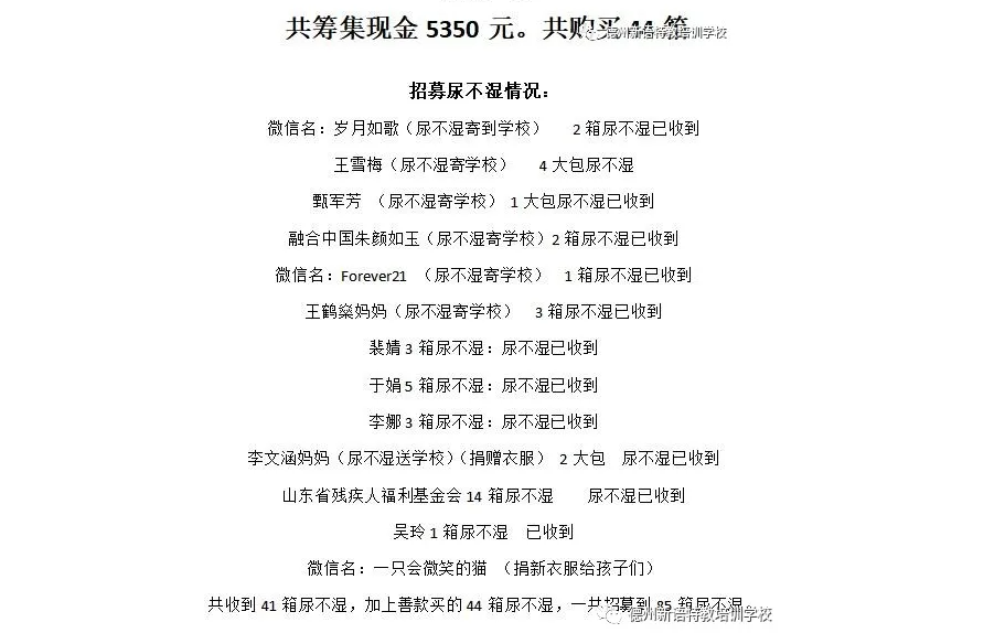 2021年10月,我們的一篇微信公眾號這是一期愛心招募,得到了社會各界愛心人士的關(guān)注和支持。我們的同學(xué),朋友,同事,甚至是素未相識的陌生人,都被這些貧困且無助的殘疾家庭深深震撼了,大家紛紛伸出援助之手,盡自己的一份力來幫助這些孩子們!這次愛心招募,我們共收到尿不濕41箱;現(xiàn)金5350元,我們利用這5350元購買了44箱尿不濕,共計(jì)85箱尿不濕,已經(jīng)送到貧困殘疾人家中82箱(其中三箱在分發(fā)時還在運(yùn)送途中,后期會繼續(xù)分發(fā)給孩子們)。