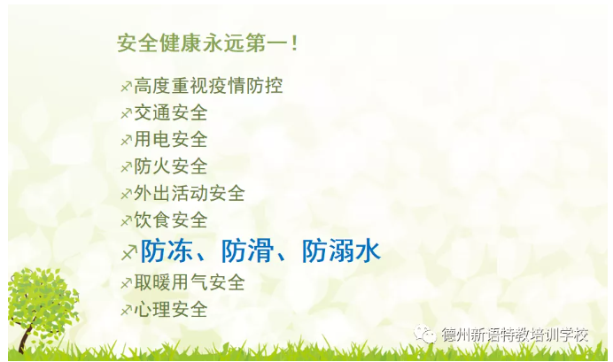 孟老師從疫情防控、交通、用電、防火、飲食、防凍、防滑、防溺水等九個方面講述了安全注意事項,尤其是冬季結(jié)冰,溝渠冰面厚薄不一,一定要杜絕下河滑冰,保證人身安全!