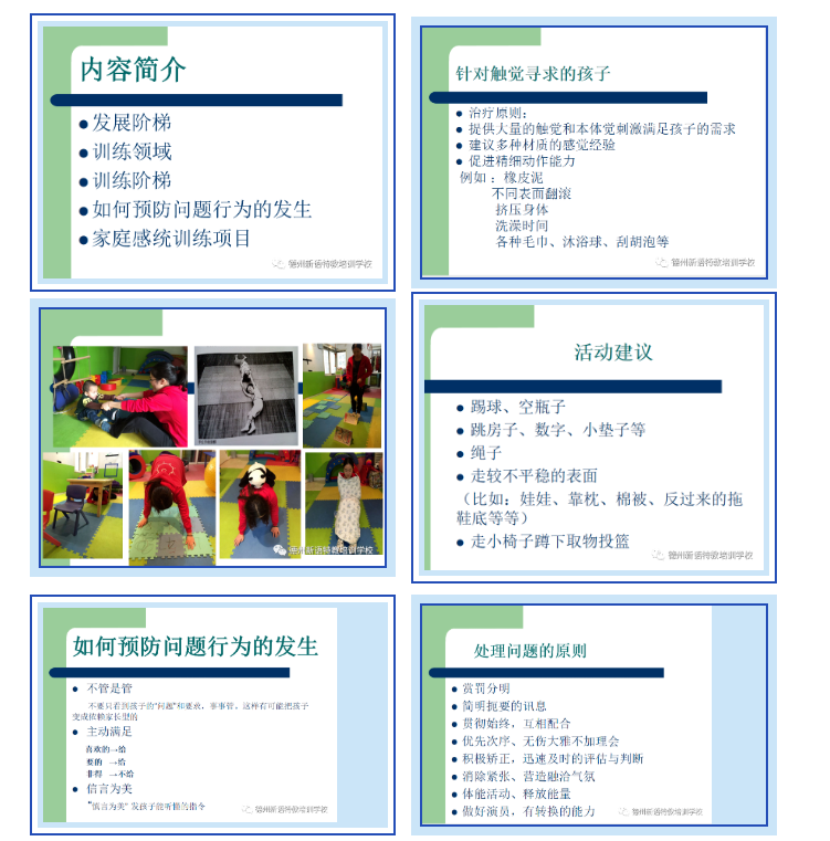 孫老師從兒童發(fā)展的階梯開始,進(jìn)而講述了兒童能力發(fā)展應(yīng)該從哪些領(lǐng)域入手,包含什么內(nèi)容,以及兒童問題行為的預(yù)防、處理措施等等,都進(jìn)行了詳細(xì)的講述,大量的文字及圖片舉例讓家長開拓了家庭康復(fù)訓(xùn)練的思路!