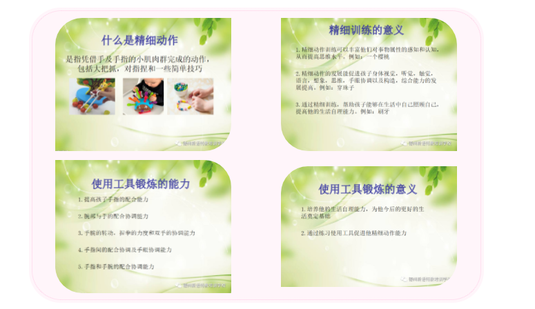肖老師用生活中常見的例子開始講解什么是精細動作,對精細訓練的意義,使用工具鍛煉的能力和意義進行了詳細的闡述。