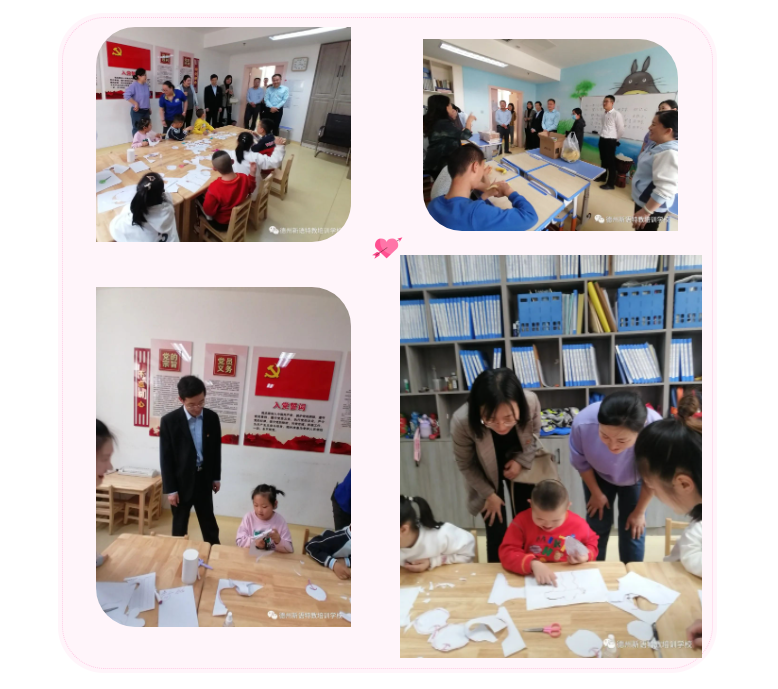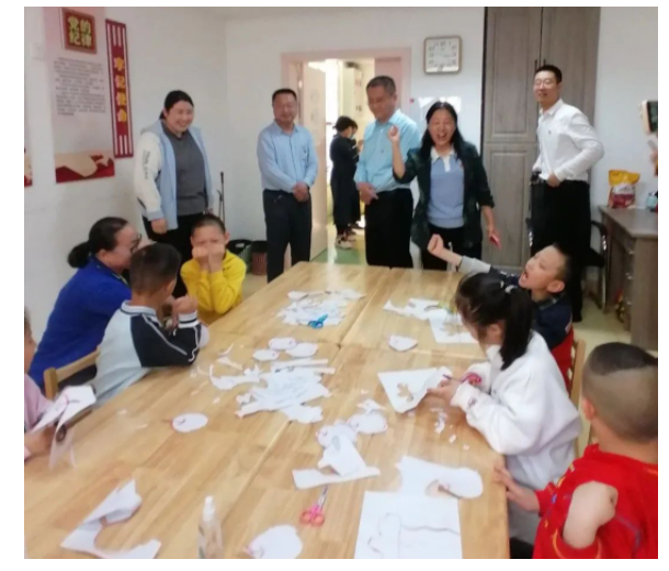教室里,統(tǒng)戰(zhàn)部的叔叔阿姨們?yōu)楹⒆觽兎职l(fā)水果,看孩子們手工作業(yè),與孩子們互動(dòng)交流,教室外,校長讓大家看墻上的鉆石畫,告訴大家這些都是學(xué)校大齡部星工坊孩子的作品,為大家講述學(xué)校一直致力于心智障礙兒童生命全周期的教育與支持。